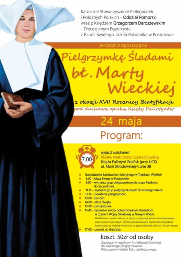 Pielgrzymka parafialna do Bł. Marty Wieckiej w Nowym Wiecu Msza Święta rano w Postołowie o godz. 8.00 po czym ruszamy w pielgrzymce do Nowego Wieca przez Pawłowo tam dołącza się sucha Huta około 10.00 i ruszamy do Szczodrowa i stamtąd do Nowego Wieca. Zapraszam młodzież zwłaszcza przygotowująca się do Bierzmowania. W Postołowie dołącza się do nas Pielgrzymka Pielęgniarek z Gdańska. O godz. 8.30 w Szczodrowie konferencja – Jak Ratować człowieka i jego rodzinę – to dla tych co nie pójdą na pielgrzymkę